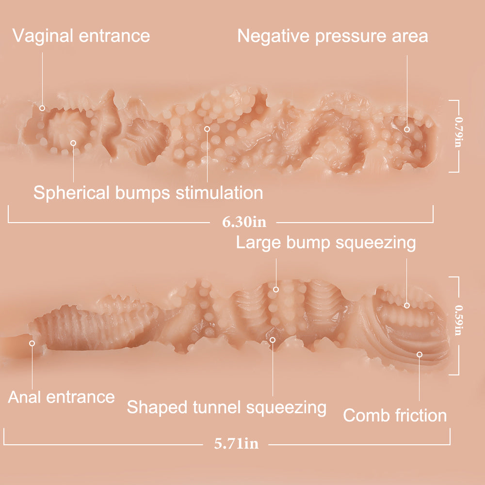There are 2 different channels of the life size love dolls, each of them can brings you incredible feeling. The lines and particles inside allow you to experience the real squeeze and friction like a real one. 6.30in long vagina toy allows you goes deeper, and 5.71in long anal toys like a great sucker, the penis feel a soft suction power here. Due to the elastic material, our pocket pussy male sex toys fits for most of the dildo size.