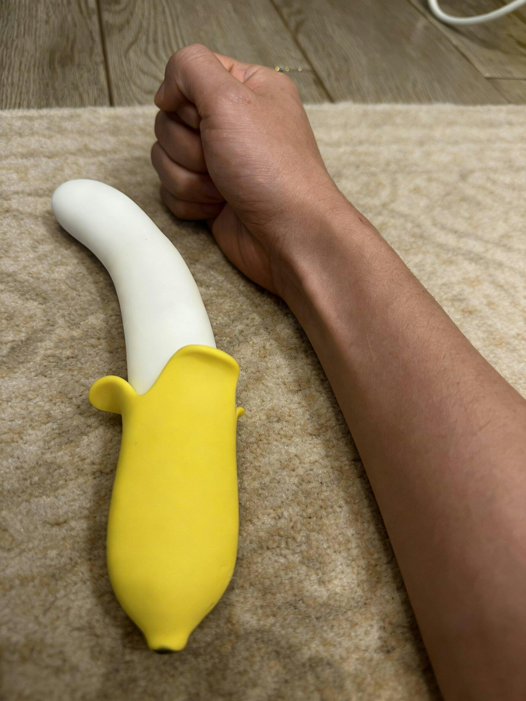 The banana shape isn't just a gimmick—it's actually really well-designed. The curve fits the body's natural contours perfectly, making it easy to use hands-free in certain positions. The silicone is squishy and soft, not rigid. The broad base makes it safe for anal play, which is a big plus for us. It's a well-thought-out toy that clearly had user comfort in mind during design.