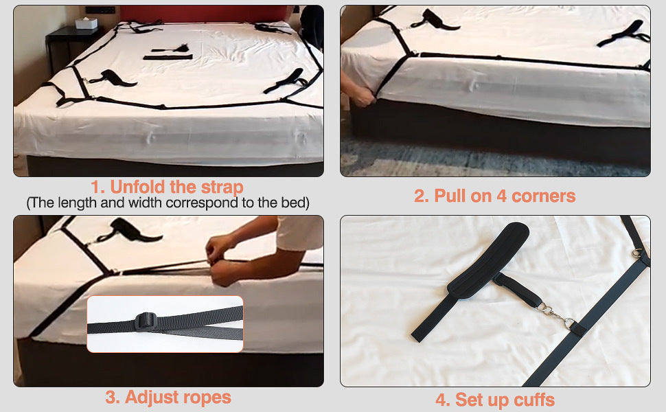 Setting up your bed restraints has never been easier. Simply unfold the strap, adjust it to fit your bed, pull the corners into place, and secure the cuffs. In just a few simple steps, you’re ready for an intense and unforgettable experience.