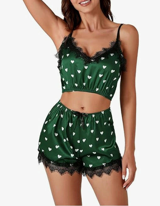 Womens Lace Cami Top and Shorts Satin Silk Lingerie Set with Robe 3 Piece Outfits Pajamas Cute Love Heart Loungewear